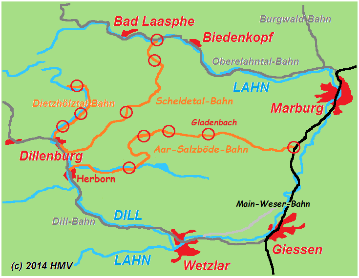 Die nach dem Eisenbahnunternehmen benannte Eisenbahnhauptstrecke führt von Kassel über Wabern, Treysa, Marburg, Giessen und Friedberg nach Frankfurt/Main.